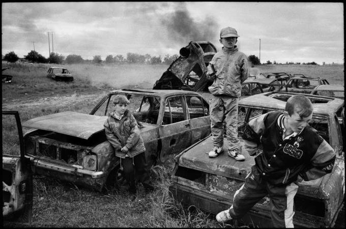 Belgian-born photographer Martine Franck’s 1993 photo of children playing in a cemetery of burnt-out stolen cars in Darndale, Dublin.