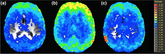 These images show a person’s brain before drinking 6 ounces of whisky (left), immediately after drinking the whisky (middle) and 90 mins after drinking (right). In these brain scans, blue represents a more chaotic brain, while yellow shows less chaos.