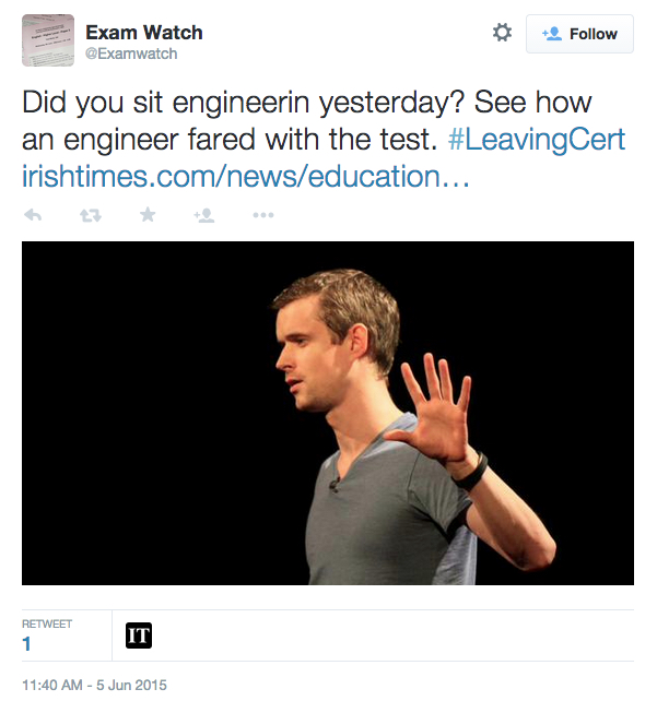 June 5, 2015Bill Linnane The Irish Times’s Leaving Cert Twitter account spelled engineering wrong. Share this: Share on X (Opens in new window) X Share on Facebook (Opens in new window) Facebook Like Loading... Related