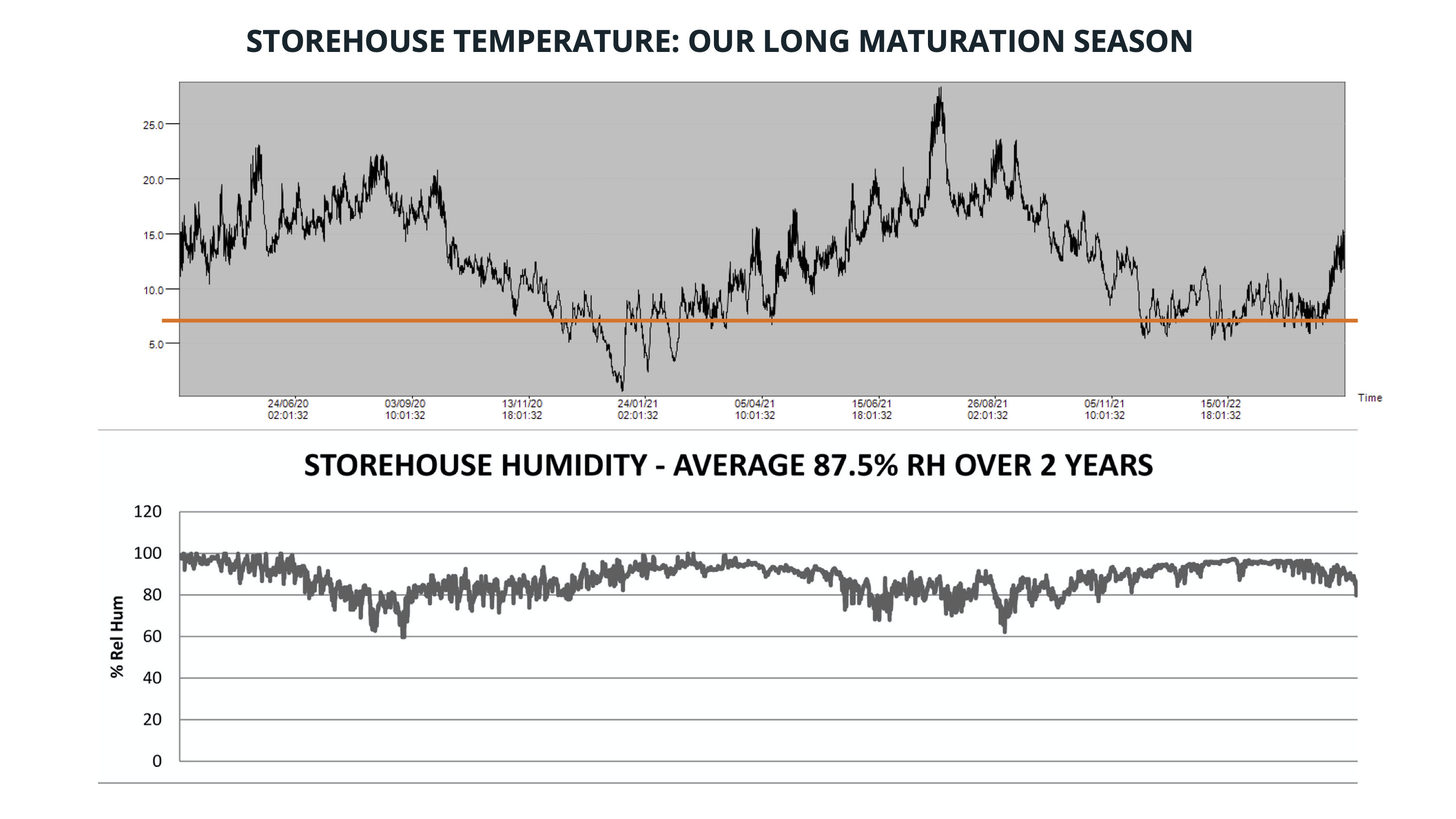“We’ve been measuring our temperature and humidity for the last four years and attached [above] is a graph for the last two showing we have a ‘maturation season’ (defined loosely as less than seven degrees celcius from which spirit interacts with wood) of 10.5 months versus six months in Speyside, for example, together with high humidity. In addition, the ‘four seasons in an hour’ Killarney weather, from the collision of Gulf Stream, mountains and lakes, equates to frequent changes in pressure governing spirit/wood interaction.”